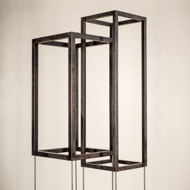 Die Thematik von Dreidimensionalität und Perspektive ist im Kontrast zur Malerei von vorneherein eng mit der Skulptur verbunden. Jürgen Heinz eröffnet jedoch in seinen Stahlplastiken durch das Zusammenspiel von konkreter Form und dem umgebenden Raum eine weitreichendere Auseinandersetzung. Konzentriert auf die Kontur treten die stark reduzierten Arbeiten zunächst ruhig und kraftvoll mit dem Betrachter in Dialog. Sie fordern auf in der gleichzeitigen Spannung von Filigranität und Schwere, von Geschlossenheit und Durchsicht die gewohnte Sichtweisen zu verlassen und neue Ebenen der Wahrnehmung zu erschließen. Erst durch die direkte Auseinandersetzung, durch einen individuellen Impuls wird die innewohnende Dynamik sichtbar. Der eigentliche Widerspruch der Statik des Materials und der Leichtigkeit einer Bewegung wird aufgehoben. Es entstehen durch zusätzliche Licht- und Schattenräume neue Spannungsfelder, die den Eindruck des Raumes verändern. Somit ziehen die Plastiken den Betrachter in einen echten Diskurs und vermitteln eine direkte Reflekion.
